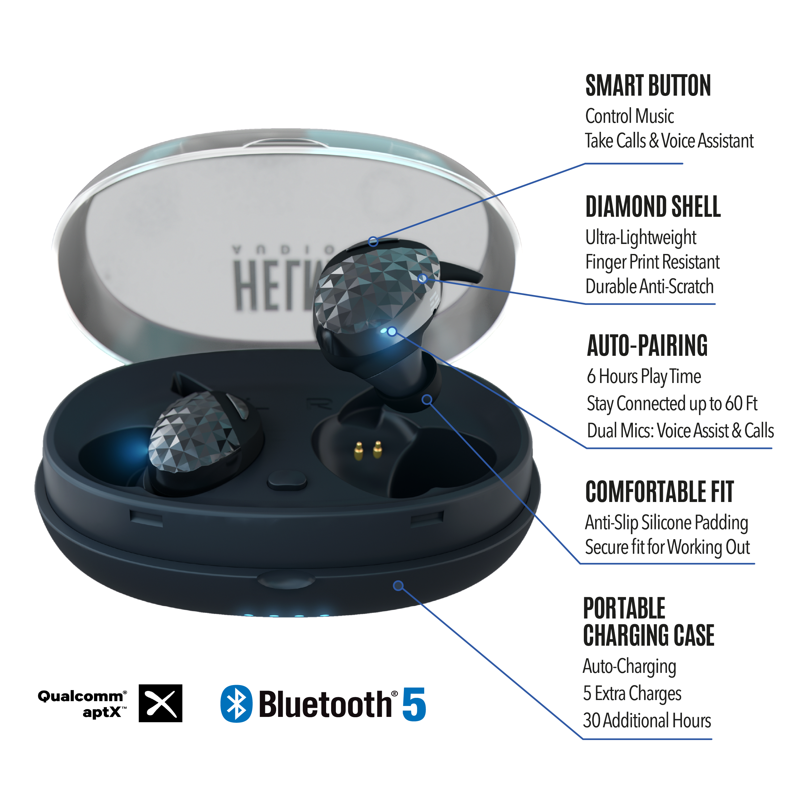 HELM’s latest release, the HELM True Wireless 5 in-ear headphones build on the success of the critically acclaimed sound, bass, comfort and sound isolation delivered by the first generation of HELM True Wireless headphones. Loaded with updated technology and features including Bluetooth 5, the Qualcomm® aptX™ Bluetooth codec featuring decreased latency, auto-pairing and auto-charging, and offering 6 to 8 hours of play time that can be extended further to 30 hours with its portable charging case. Class-leading Bluetooth connectivity provides an impressive range of 60 feet, dual stereo mics deliver clear full stereo music and phone calls. Easy access smart buttons allow you to completely control your music, volume, easily control phone calls, and access your favorite voice assistant. The unique look of the diamond pattern shell is durable and scratch resistant, its anti-slip silicone padding provides a secure fit for any activity and voice notifications keep you in control. These features place the HELM TW5 at the front of the pack of any true wireless competitors, and at a value that rivals any of the other premium true wireless brands.
